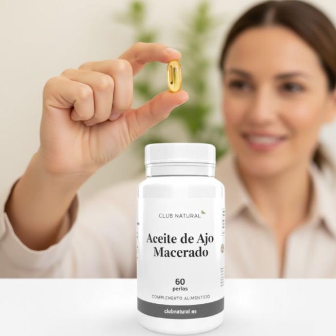 Suplemento natural elaborado con aceite de ajo macerado desodorizado, rico en compuestos sulfurosos como la alicina, antioxidantes y sustancias tradicionalmente valoradas por su apoyo al bienestar cardiovascular.